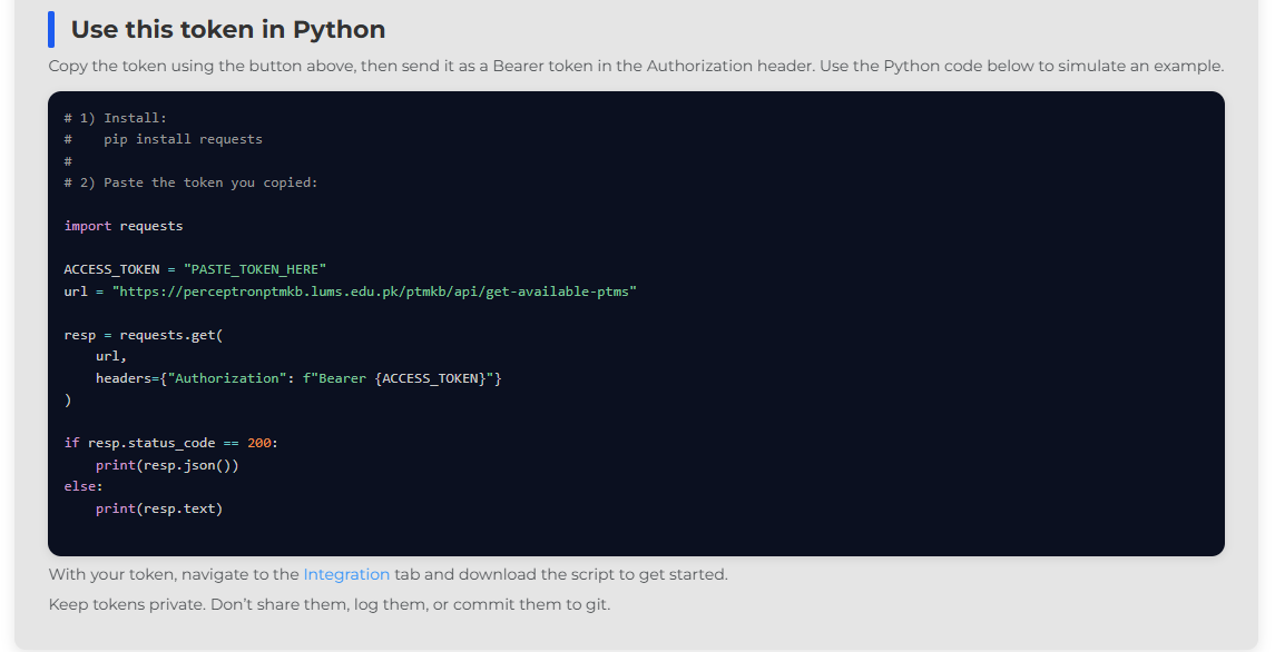 To use the token, a starter guide is presented in the image above. Here, users can copy this code snippet and run the Python code with their copied token. To expand on the implementation further, users can always navigate to the Integration page for more details.