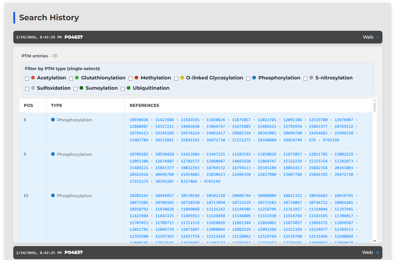 Each search entry retrieves a list of clean dbPTM data. This data only references the position of the modification, the type of modification, and the list of evidence identifiers to support the claim. You also have the option to filter the results by modification, allowing quicker navigation.