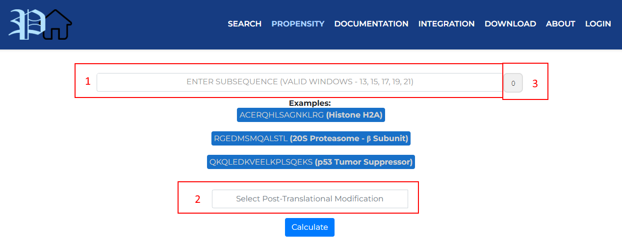 In [1], enter the protein subsequence for which you want to calculate the Propensity. This subsequence must have a length between 13 and 21, and must be an odd value to account for equal number of upstream and downstream residues. The counter ([3]) on the right side of the subsequence input lets you know how long your subsequence is.