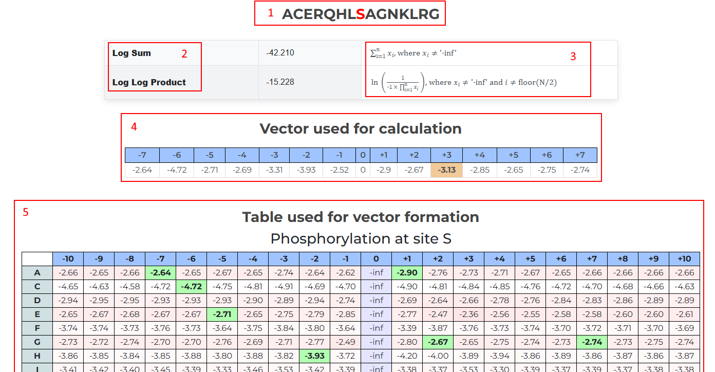 [1] shows the input subsequence, with the red-color residue denoting the center of the subseuqence - i.e. the residue for which Propensity is being calculated. [2] shows the Log Sum and the Log Log Product Propensity scores. These give an educated guess on the tendency of a residue to undergo a PTM given its neighbouring residues. How these values are calculated are shown in [3]. The vector data constructed in [4] is passed through the equations for each score. The vector in turn is constructed from the table in [5]. The more red a cell is, the higher its probability is, and green cells denote the values which were picked against the residues at their positions relevant to the PTM site.