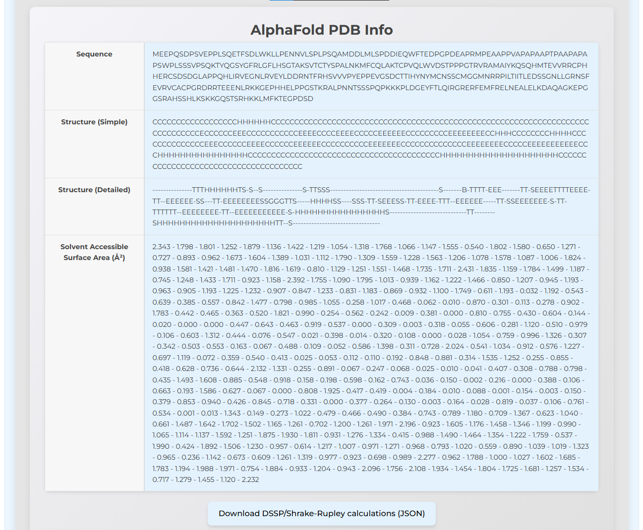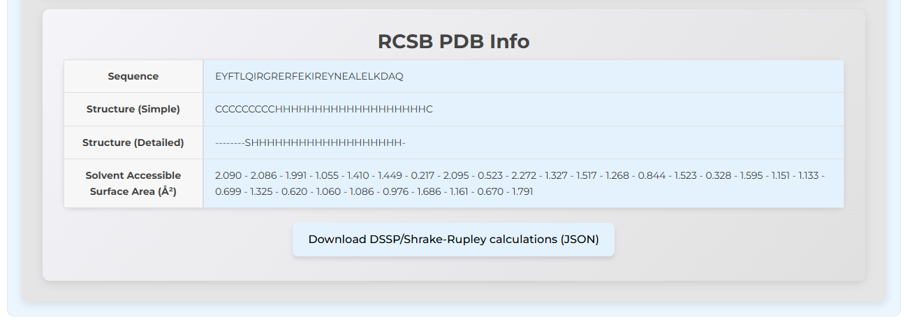 The sequence, simplified DSSP calculations, detailed DSSP calculations, and the Shrake-Rupley SASA values are given for both the AlphaFoldDB PDB and the RCSB PDB. These can be downloaded individually as a JSON file.