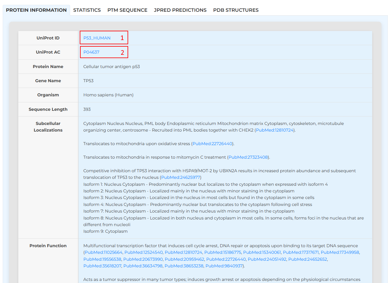 First, general information about the input protein is displayed. [1] and [2] are hyperlinks to their respective UniProt pages. The following information is displayed:
