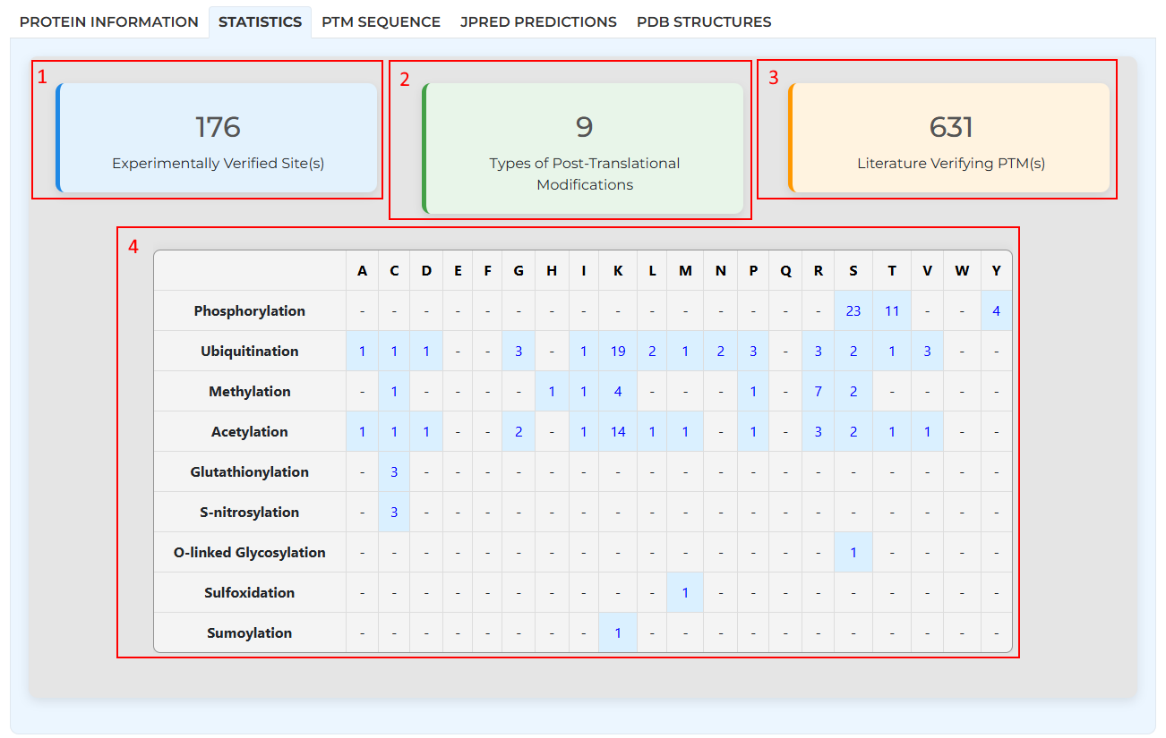 [1], [2], and [3] respectively show the number of experimentally verified PTM sites for the protein, the number of unique PTMs experimentally observed on this protein, and the total number of literature recorded across all PTMs. [4] shows the overall summary of all PTMs observed on all residues for the input protein. As for the detailed information about the PTMs of the protein, further down is information about the PTM sequence: