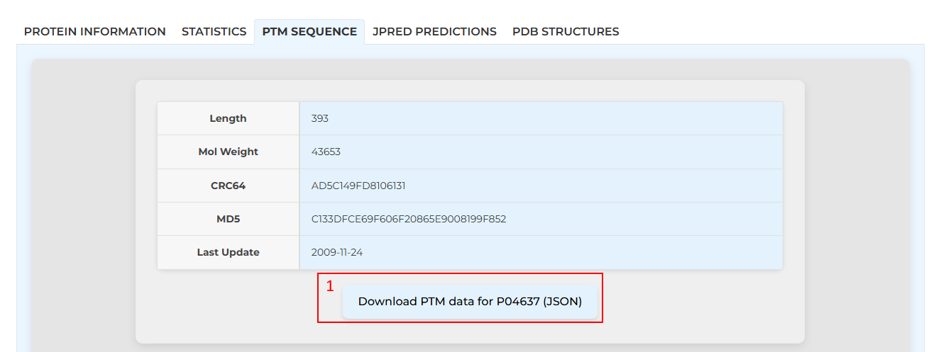 This shows some UniProt-enabled information about the protein sequence with the option to download the PTM data as a JSON file (see [1]). The actual retrieved sequence is displayed just below the general sequence information: