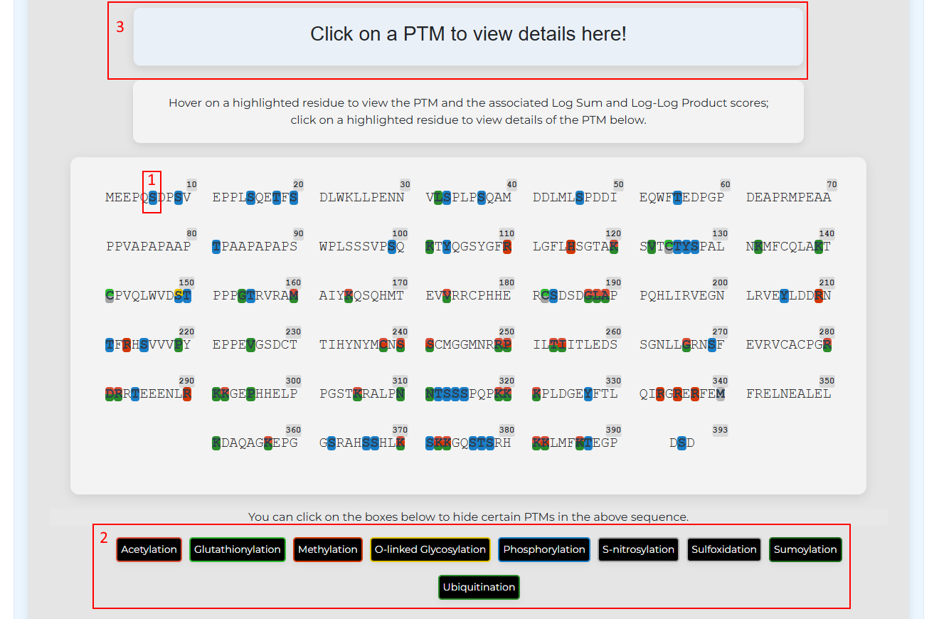 You can hover over a highlighted amino acid/residue (like [1]) to see what PTM is occurring on it. When you click on the highlighted residue, detailed information about the PTM will be shown in [3]: