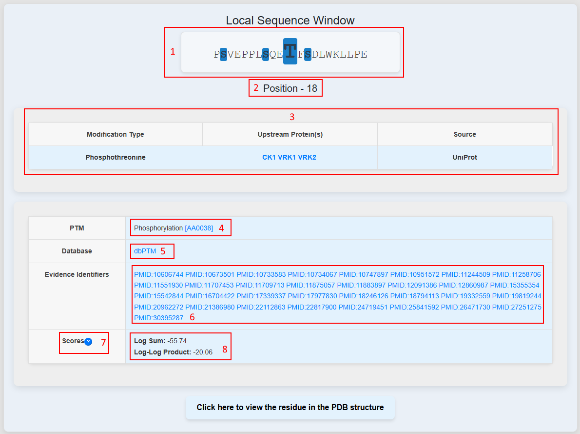 Below the modification table is the dbPTM-annotated information about the amino acid. If applicable, a RESID Database ID is also provided alongside the PTM type ([4]). The source database where this PTM is fetched can be see in [5]. For the PTM, evidence identifiers ([6]) are provided as hyperlinks to their respective PubMed article. The Log Sum and Log-Log Product scores (if applicable) are shown as well (see [8]). If you want to know how these scores are calculated, you can click on the question mark ([7]) and it will lead you to a new page explaining the calculation (see the Propensity page info below).
