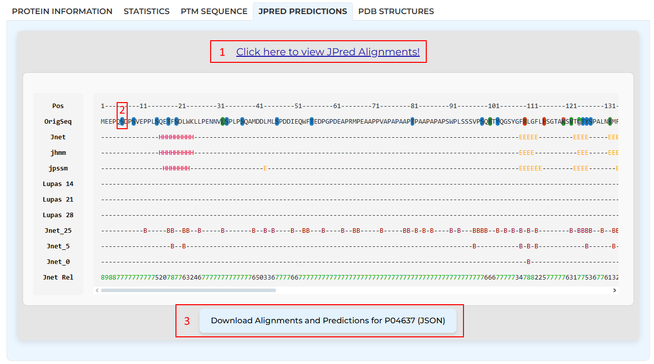 As JPred also provides hyperlink-embedded alignments, we have shown them as a separate page ([1]). As for the prediction, JPred's own format is followed. Upon clicking on a PTM ([2]), the entire column is highlighted to make it easier for the user to see the secondary structure, any coils, the residue burial percentage, and the confidence scores. Finally, all of the aforementioned information can be downloaded as a JSON file ([3]).