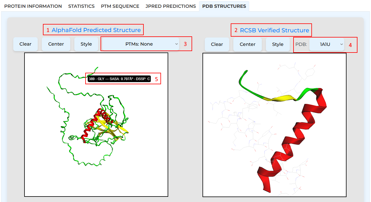 [1] and [2] are hyperlinks to the respective database for extensive additional information. We use 3Dmol.js to view the PDB structures. Some buttons are provided to cycle through three different styles, clear all selections made by the user, and re-center the render should the user lose sight of the structure. For the AlphaFold sequence, you can view the PTMs by selecting one PTM or all PTMs from the dropdown in [3]. Additionally, since all PDBs in the RCSB Protein Data Bank are queried using the UniProt Accession Number, you can select from one of many possible PDB IDs in [4].